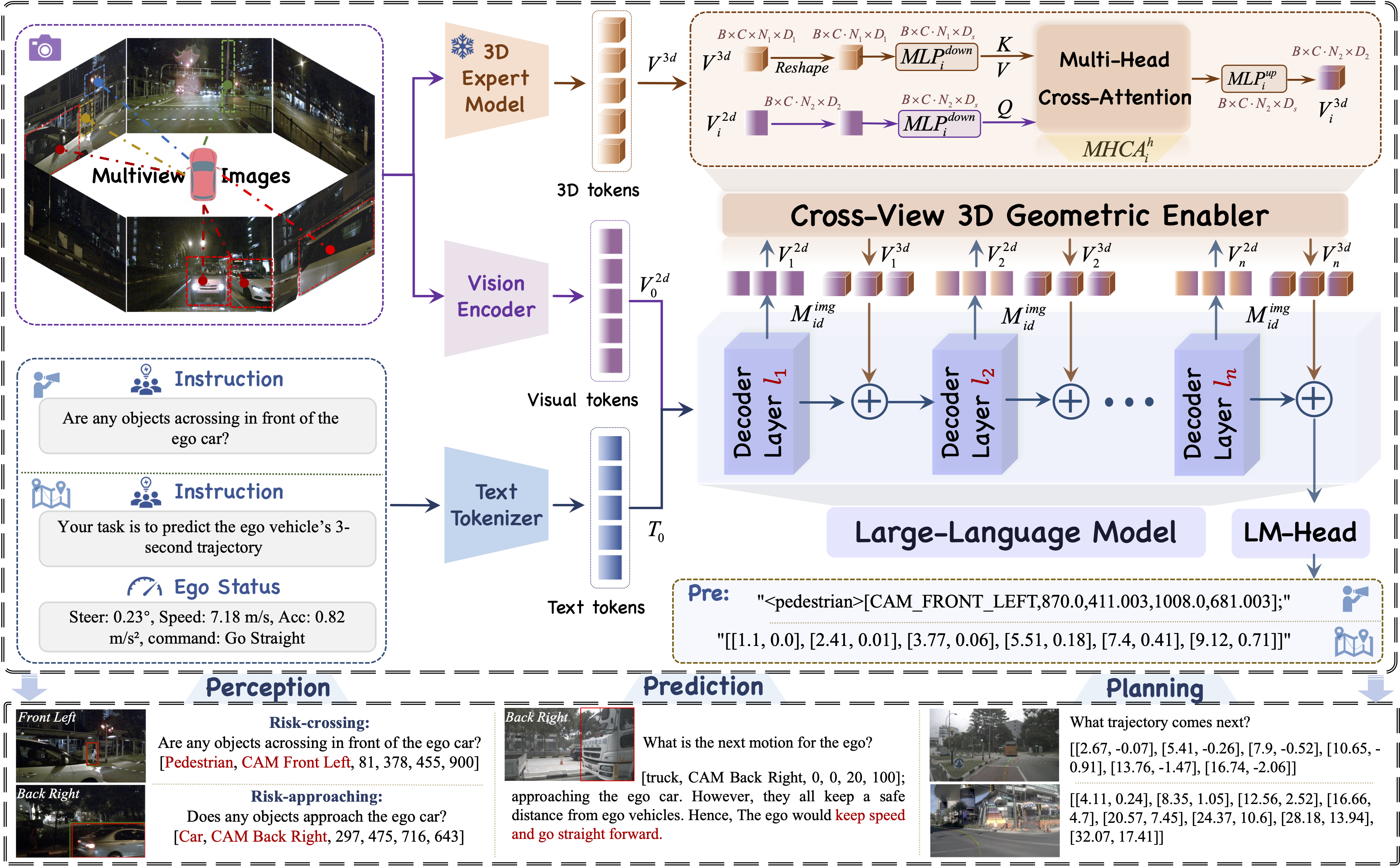 🧩 Conventional VLMs in autonomous driving “understand language but lack geometric insight.” Even when augmented with constructed Q&A data for auxiliary training, such approaches provide only superficial improvements and fail to address the core limitation in cross-view 3D spatial understanding.