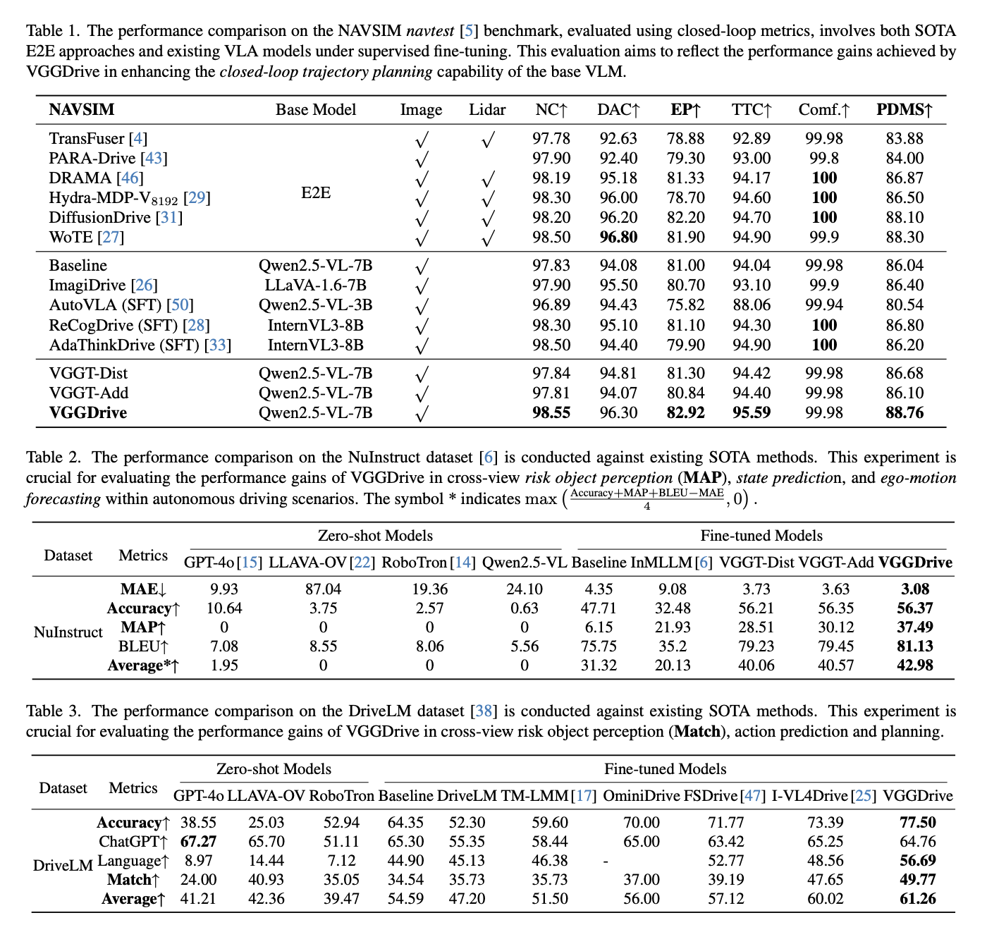 📈 Importantly, VGGDrive is not limited to single-task optimization. It consistently improves performance across five mainstream autonomous driving benchmarks, covering cross-view risk perception, scene understanding, motion and state prediction, and trajectory planning, thereby enhancing the full pipeline from perception to decision-making.