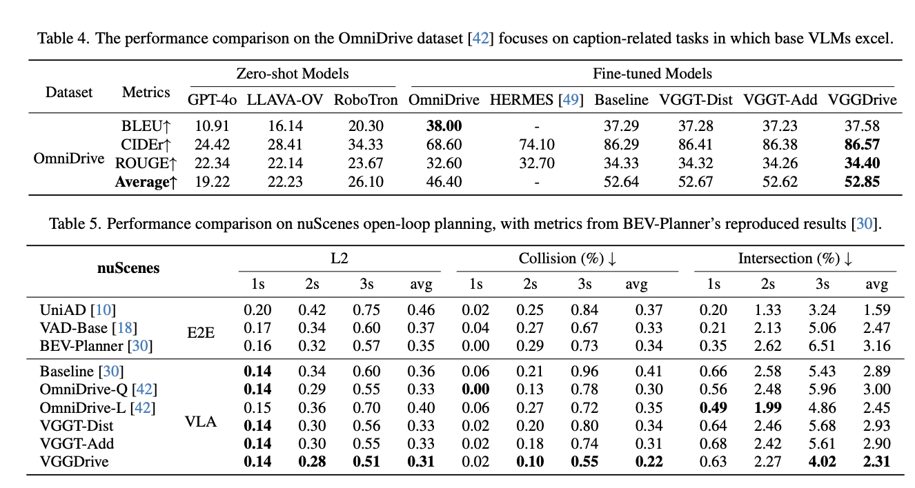 VGGDrive excels in both language-focused tasks like OmniDrive and open-loop trajectory planning on NuScenes, demonstrating the effectiveness of integrating 3D foundation models to enhance cross-view perception, trajectory prediction, and overall VLM-based autonomous driving performance..